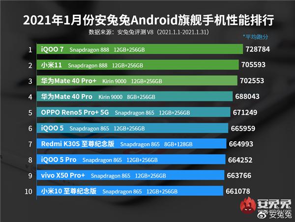 其余進入榜單的機型還有:華為 Mate 40 Pro(平均跑分 688043)、OPPO Reno5 Pro+(平均跑分 671249)、iQOO 5(平均跑分 665959)、Redmi K30S 至尊紀念版(平均跑分 664993)等。