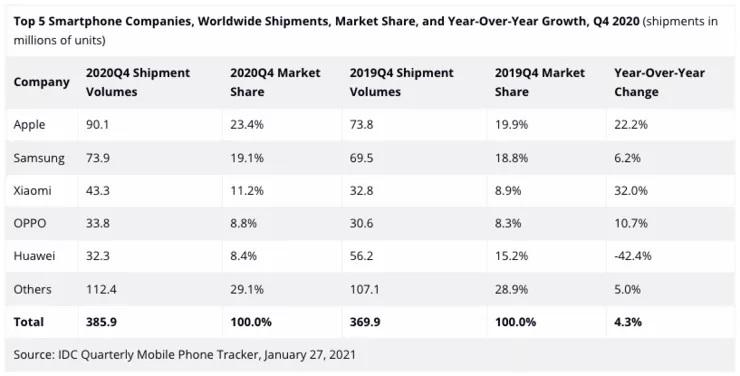 市場調研機構 IDC 公布的 2020 年第四季度全球智能手機出貨量數據可以看出,華為受到美國制裁的打擊,影響愈發嚴重。在前五名當中,小米同比增長幅度最大,為 32%,其次則是蘋果同比增長 22.2%,前五名當中僅有華為下降幅度達到 42.4%。