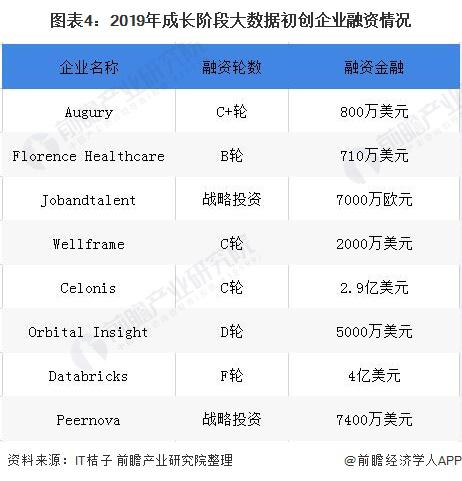2019 年,很多處于成長階段的大數據初創企業拿到了不少的可觀融資,其中包括:Databricks ( 4 億美元 F 輪 ) ,Celonis ( 2.9 億美元 C 輪 ) ,Peernova ( 7400 萬美元戰略融資 ) ,Orbital Insight ( 5000 萬美元 D 輪 ) 等。