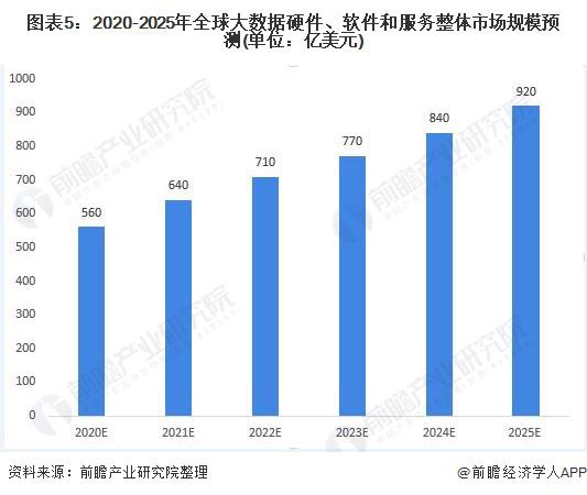 雖然全球經濟預期下行,但不論是企業還是政府對大數據的需求依然旺盛。據 Wikibon 預計,2020 至 2025 年,大數據增長率將出現較小幅度的放緩,維持在 10%-15% 之間,據此推測,2025 年全球大數據硬件、軟件和服務整體市場規模將達到 920 億美元。