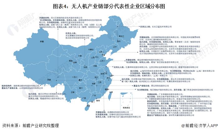 無人機產(chǎn)業(yè)鏈主要分為三個部分:設(shè)計及關(guān)鍵原材料、無人機制造、無人機應(yīng)用領(lǐng)域。目前,無人機電池的技術(shù)在短時間內(nèi)都較難獲得突破性的進(jìn)展,續(xù)航問題是無人機產(chǎn)業(yè)發(fā)展的重要瓶頸。中國無人機產(chǎn)業(yè)鏈代表性企業(yè)分布在廣東、江蘇、北京、上海等地區(qū),廣東的無人機產(chǎn)業(yè)鏈代表性企業(yè)聚集程度最高。