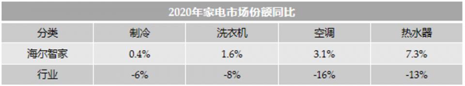 也正是數(shù)十年的家電領(lǐng)域知識積累、過硬的內(nèi)功,以及通過組織進化來精準快速地了解用戶需求,還有搭建起了龐大的 " 朋友圈 ",海爾智家才展現(xiàn)出了遠高于行業(yè)的抗風險能力——整個 2020 年,中國家電行業(yè)整體市場規(guī)模遭遇兩位數(shù)負增長,各個細分市場也悉數(shù)出現(xiàn)下滑,但海爾智家卻全線飄紅,不僅逆勢增長,反而進一步提升市場份額。