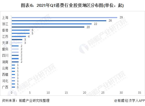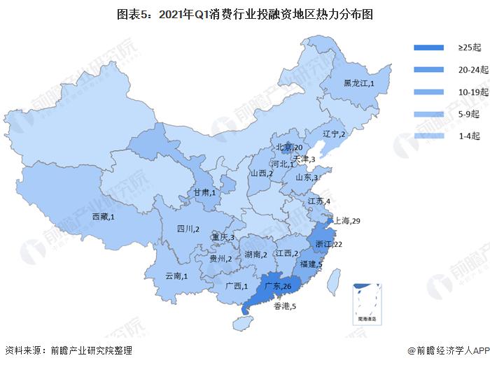 在區域熱力圖中可以看出,消費行業的投融資事件具有一定的地域性,集中于發展較快的省份,且華東地區的投融資地區較為集中,而華北和華南的事件較為分散于各地區 ; 西南、華中、西北及東北地區鮮少分布。