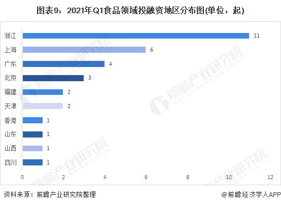 食品領域的投融資事件區域性特征與消費行業總體相似。在浙江的事件最多,為 11 起,是第二名上海的近 2 倍 ; 第三位是廣東,其數量為 4 起。