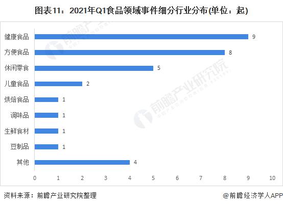 2021 年一季度,健康類食品和方便類食品領域的投融資事件數量最多,分別為 9 起和 8 起 ; 其次是休閑零食,共 5 起投事件。