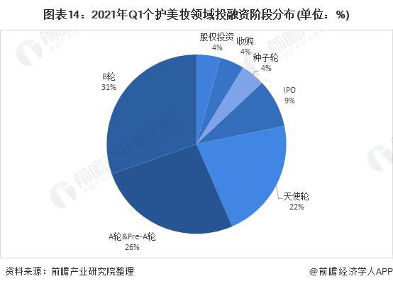 個護美妝領域投融資階段多處于 B 輪,其投融資事件數量占總數的 31%,其次為 A 輪 &PreA 輪和天使輪階段,分別為 26% 和 22%; 達到 IPO 階段的共占 9%。