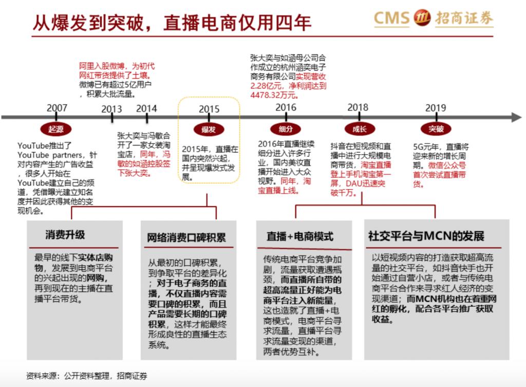 據招商證券發布的《直播電商三國殺》報告顯示,從 2015 年開始,以短視頻、直播為主要載體,依托優質內容激發消費者興趣的電商生態,在國內突然興起,并呈現爆發式發展。