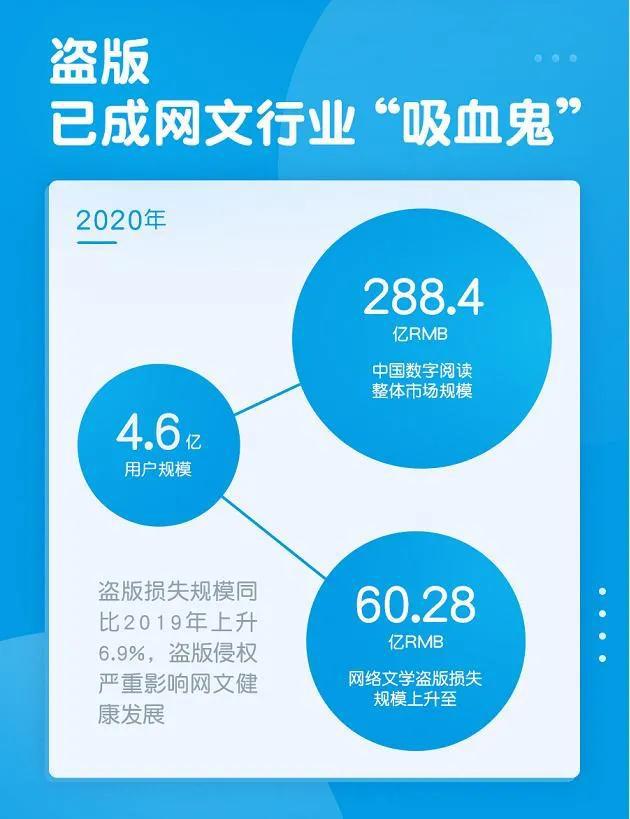 但長期存在的網文盜版問題如影隨形。白皮書顯示,2020 年中國網絡文學盜版損失規模達 60.28 億元,同比 2019 年上升 6.9%,新技術濫用、傳播途徑雜多和盜版在全產業鏈實現覆蓋是規模上升的主要因素。