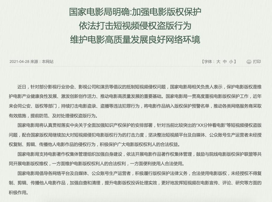 4 月,長視頻行業超 70 家影視傳媒單位及 500 多位從業人員先后兩次發布《聯合聲明》,呼吁短視頻平臺和公眾賬號生產運營者切實提升版權保護意識,停止對影視作品內容的侵權行為。中宣部版權管理局和國家電影局隨后宣布打擊短視頻侵權行為。