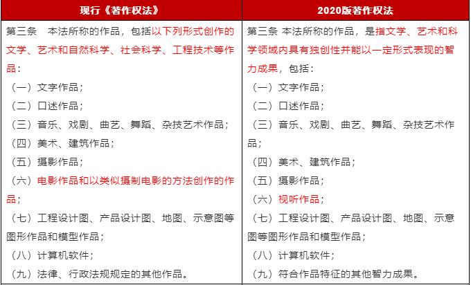比如此前對視聽行業作品類型的描述是 " 類電作品 "(電影作品和以類似攝制電影的方法創作的作品),但如短視頻、網絡直播等新作品類型,2010 版推出時還不存在。在新的《著作權法》里,將 " 類電作品 " 改為 " 視聽作品 ",將近十年出現的新品類囊括其中。