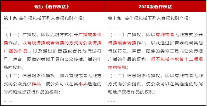 這些問題在新《著作權法》中得到了一定解決。第十條的廣播權加上了 " 有線或者無線方式 " 的表述,將涉及范圍擴展到了直播等互聯網形式。此外,新增第五十一條中明確指出 " 知道或者應當知道作品、版式設計、表演、錄音錄像制品或者廣播、電視上的權利管理信息未經許可被刪除或者改變,仍然向公眾提供 ",明確平臺責任。