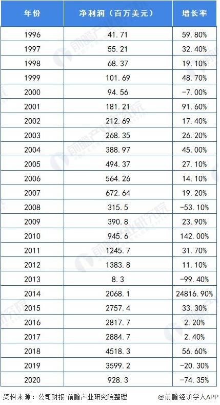 圖表 1:1996-2020 年星巴克凈利潤(rùn)及增速(單位:百萬美元,%)