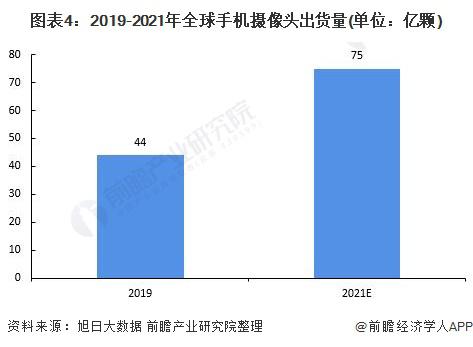 因此,盡管手機出貨量呈下滑態勢,但手機多攝滲透率、手機平均搭載攝像頭數量不斷提升,全球手機攝像頭出貨量呈上升態勢。根據旭日大數據統計與預測,2019 年全球手機攝像頭的出貨量在 44 億顆左右,預計 2021 年全球手機攝像頭的出貨量將增長至 75 億顆。