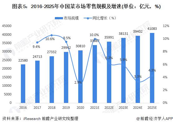 2020 年中國菜市場零售規模為 30810 億元,受 2020 年初疫情影響,2020 年菜市場零售規模增速仍保持正向增長,但相較于前幾年來說,增速處于較低水平。隨著菜市場的數字化改造和智慧升級,艾瑞預測未來一段時間菜市場將保持穩步增長,到 2025 年,菜市場零售規模將達到 41083 億元。