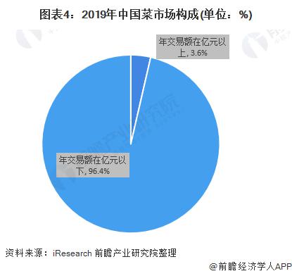從菜市場結構來看,2019 年中國菜市場成交額在億元及以上的菜市場數量僅有 1430 個,占比僅為 3.6%,市場較為分散,96.4% 的菜市場年成交額在億元以下。