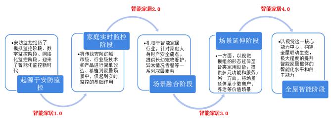 家用智能視覺 1.0 起源于安防監控系統,是對傳統安防的簡單裁剪和移植,然而隨著智能家居的普及化,家用智能視覺形成了獨立的市場模式和賽道,其應用不再停留在基礎監控上,在家用智能視覺 2.0 時代,智能視覺與智能家居深度融合,極大豐富了家用攝像頭的功能和滿足家庭安防剛性需求,并在家用智能視覺 3.0 時代實現了多硬件搭載和多場景延伸,創新型的提升了智能家居體驗。在未來的 4.0 時代,家用智能視覺將在智能家居中起到領導、協同調度的作用,以視覺能力提振智能家居整體的用戶體驗,真正走進自主感知、自主反饋、自主控制的全屋智能階段。