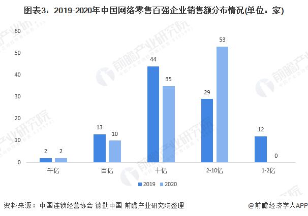 從上榜網(wǎng)絡(luò)零售百強(qiáng)企業(yè)的銷售門檻上看,網(wǎng)絡(luò)銷售門檻從 2019 年的 1 億元以上提升至 2020 年 2 億元人民幣以上。2020 年,網(wǎng)絡(luò)銷售額超過千億的企業(yè) 2 家,與 2019 年持平 ; 百億級(jí)企業(yè) 10 家,與去年相比減少 2 家 ; 十億級(jí)企業(yè) 35 家,與 2019 年相比減少 9 家 ; 億元級(jí)企業(yè) 53 家。
