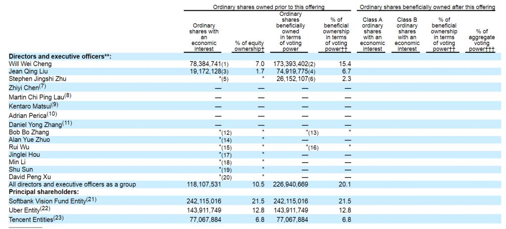 招股書顯示,程維持有滴滴 7% 的股權,15.4% 的投票權。滴滴聯合創始人、總裁柳青持股 1.7%,投票權 6.7%,朱景士持股比例低于 1%,具體比例未顯示,投票權為 2.3%。軟銀愿景基金(Softbank Vision Fund Entity)持股高達 21.5%,投票權 21.5%,Uber 持股 12.8%,投票權 12.8%,騰訊持股 6.8%,投票權 6.8%。