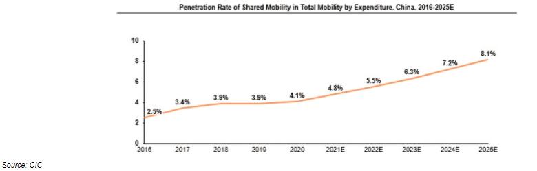 根據滴滴在招股書中披露的數據,共享出行的滲透率正在穩步提升,2020 年滲透率為 4.1%,預計 2025 年將增長至 8.1%。長期來看,2040 年時,共享出行的滲透率有望達到 36%。