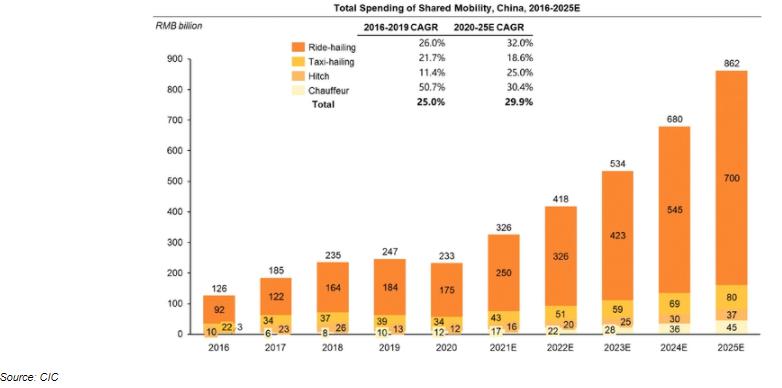 不斷攀升的滲透率為網約車生意帶來了極大市場機遇。灼識咨詢的數據顯示,中國市場花在共享出行上的錢有望從 2020 年的 2330 億元增長至 2025 年的 8620 億元,復合增速為 30%。其中,網約車服務在共享出行市場中占比最大,有望從 2020 年的 1759 億元增長至 2025 年的 7000 億元。