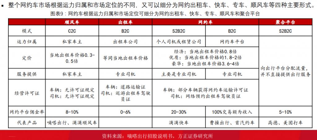 核心商業邏輯非常簡單:消費者通過平臺打車,平臺匹配車輛完成服務,消費者付費,平臺從交易金額中抽取提成,一般在 5%-20% 之間。根據運力歸屬和市場定位可以分為網約出租車、快車、專車、順風車和聚合平臺。