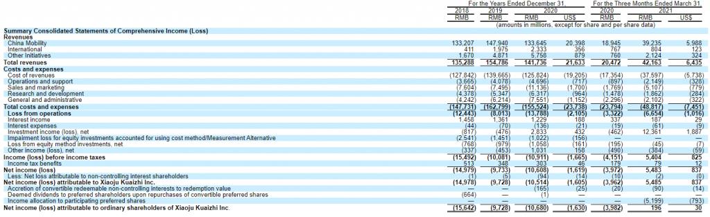 數據顯示,從 2019 年開始,滴滴的中國出行業務開始實現約 3% 左右的息稅前利潤,但國際業務及其他業務目前還在投入期,整體仍有巨額虧損。2020 年,虧損額為 106 億元,2018-2020 年虧損額總計 353 億元。一季度雖利潤為正,但盈利來源為投資收益,經營性利潤仍為負。
