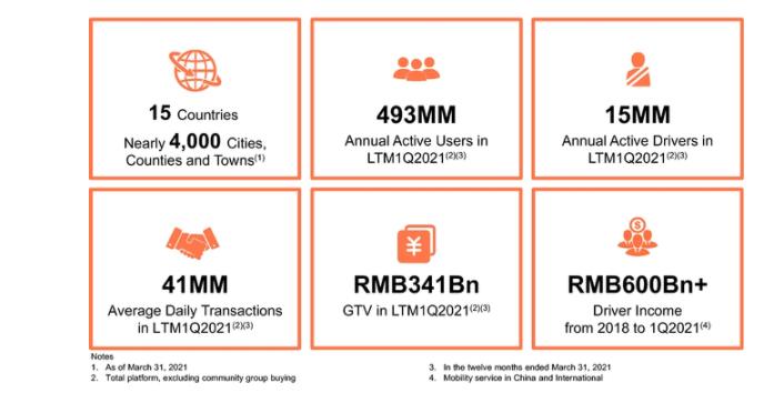 在截至 2021 年 3 月 31 日的 12 個月里,滴滴全球年活躍用戶為 4.93 億,全球年活躍司機 1500 萬。其中,去年一季度末至今年一季度末,滴滴在國內擁有 3.77 億年活躍用戶和 1300 萬年活躍司機。2021 年第一季度,滴滴中國出行擁有 1.56 億月活用戶,國內出行業務日均交易量達 2500 萬次。