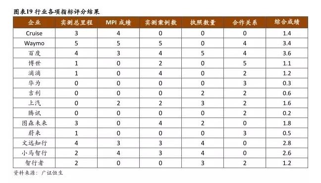 此前,廣證恒生團隊曾經發布了一組 2019 年自動駕駛行業排名,各項指標中,百度綜合成績達到 3.6 分,位列第一。第二名是谷歌旗下的 Waymo,之后是國內兩家創業公司。滴滴及騰訊都排在非??亢蟮奈恢茫蔚巍⑷A為、騰訊三家加起來,綜合成績都沒有百度高。