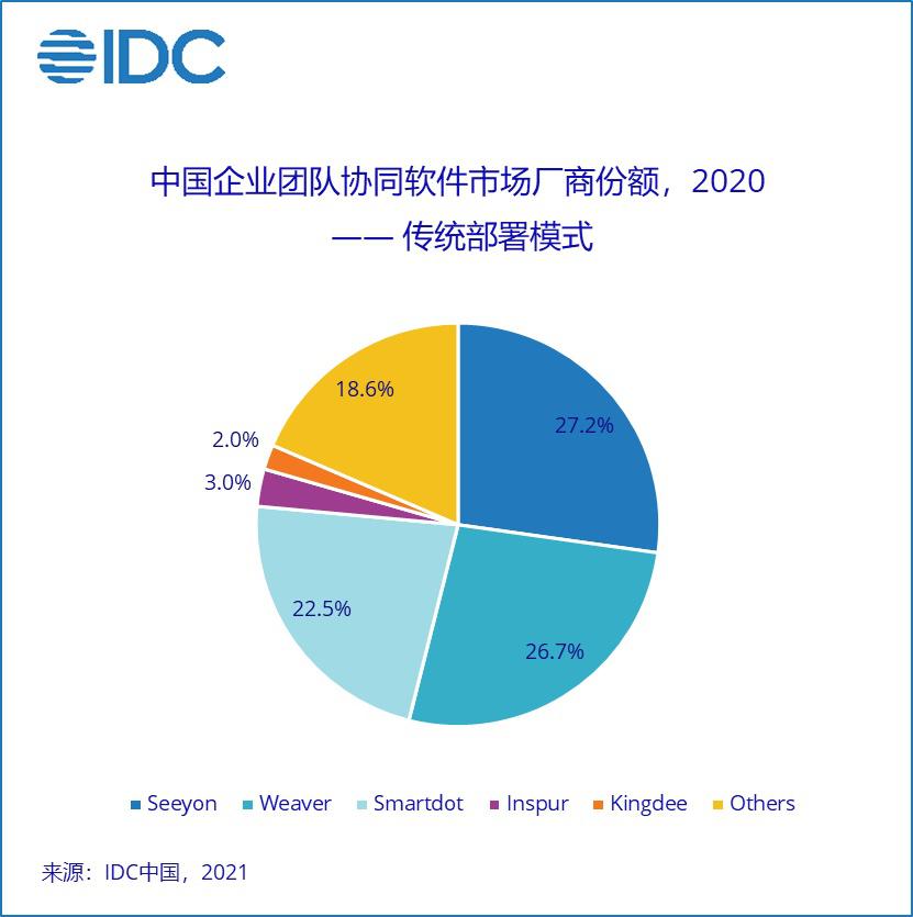 致遠互聯(Seeyon)、泛微(Wearver)和慧點科技(Smartdot)都是中國本土老牌的協同廠商,近幾年不斷完善產品結構,使產品能滿足大、中、小型等不同企業類型的需求。在傳統部署模式市場中,致遠互聯以 27.2% 的市場份額排名第一;泛微和慧點科技分別以 26.7% 和 22.5% 排在第二、三位。