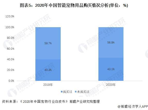 根據(jù)《2020 年中國寵物行業(yè)白皮書》數(shù)據(jù)顯示,2020 年,有 43.1% 的寵物主購買過智能寵物用品,較 2019 年同比增長了 2.8 個百分點。