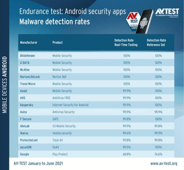 AV-TEST 實驗室安全研究人員在 2021 年 1 月 -2021 年 6 月對 15 款安卓安全 APP 進行了為期 6 個月的安全測試。這 15 款安卓安全 APP 廠商分別是 AhnLab、Avast、AVG、Avira、Bitdefender、F-Secure、G DATA、Google、Ikarus、Kaspersky、McAfee、NortonLifeLock、Protected.net、securiON 和 Trend Micro。其中 Google Play Protect 是內置在安卓中的,谷歌稱該保護一直是開啟的,會自動評估設備上的每個 APP。