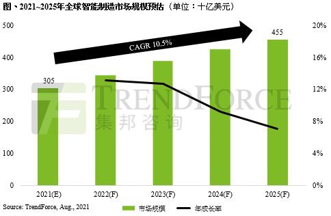 受惠于新冠疫情之下數字化轉型加速,以及遠端作業、自動化等需求提升,并攜帶 5G、深化 AI 技術等加值服務,推升 2021 年全球智能制造市場規模至 3050 億美元,預期至 2025 年有望達 4500 億美元,年復合成長率達 10.5%,將迎來制造業黃金五年。