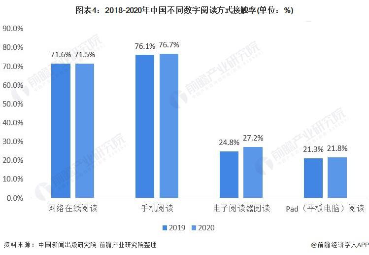 從數(shù)字閱讀方式來看,手機(jī)閱讀網(wǎng)絡(luò)在線閱讀是用戶數(shù)字化閱讀的主要方式。根據(jù)中國新聞出版研究院調(diào)研數(shù)據(jù)顯示,2020 年 76.7% 的用戶通過手機(jī)進(jìn)行閱讀,較 2019 年增長 0.5 個(gè)百分點(diǎn) ; 通過網(wǎng)絡(luò)在線閱讀的用戶占比為 71.5%,較 2019 年下降 0.1 個(gè)百分點(diǎn)。