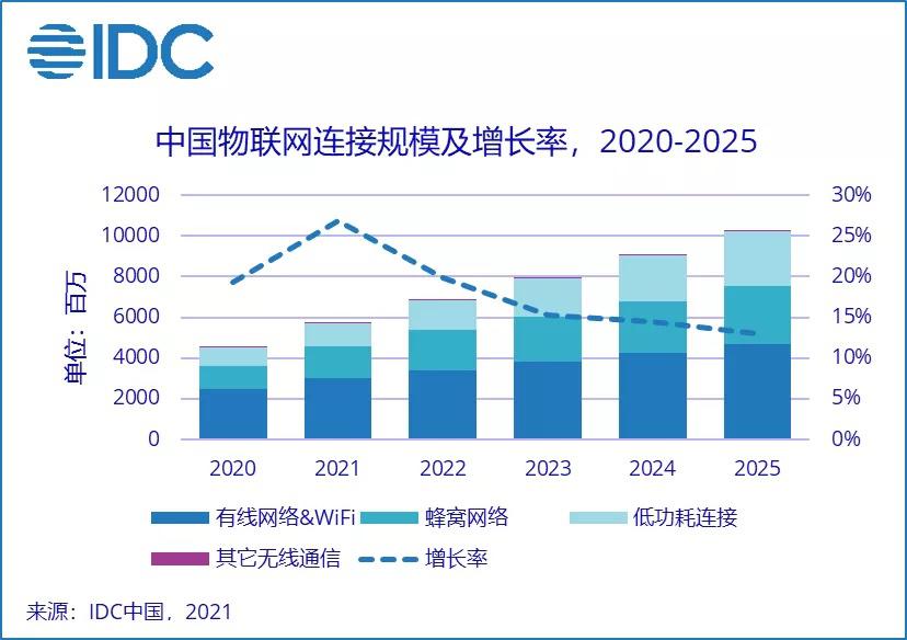 IDC 發布了最新的《中國物聯網連接規模預測,2020-2025》報告,從連接類型、連接行業等維度,對中國物聯網 IP 連接量做出趨勢判斷。連接類型方面,固網和 WiFi 占比最高,但低功耗連接增速更快。行業方面,消費者、專業服務行業、交通、政府等行業將保持較快增長。IDC 預測,到 2020 年底,中國物聯網 IP 連接量達到 45.3 億,2020-2025 年,中國物聯網 IP 連接量年復合增速 17.8%,到 2025 年總連接量將達到 102.7 億,并將占到亞太(除日本)總連接量的 84%。