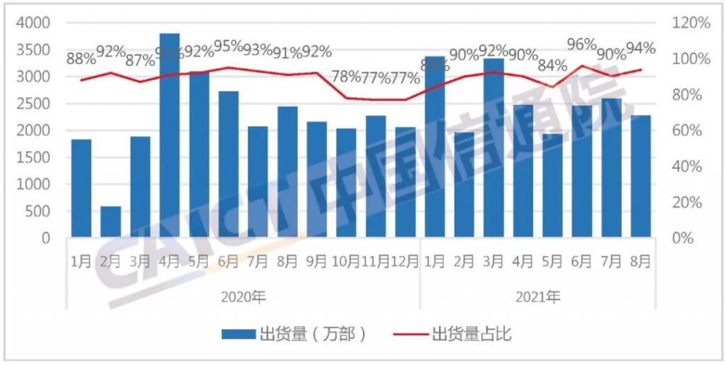 2021 年 8 月,智能手機出貨量 2308.0 萬部,同比下降 9.9%,占同期手機出貨量的 95.0%。2021 年 1-8 月,智能手機出貨量 2.22 億部,同比增長 13.3%,占同期手機出貨量的 97.7%。