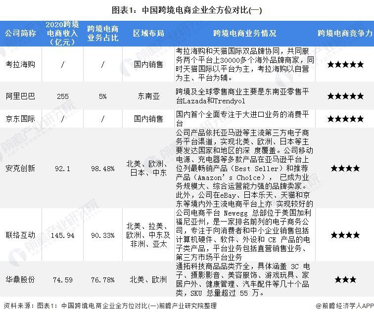 跨境電子商務是指分屬不同關境的交易主體,通過電子商務平臺達成交易、進行電子支付結算,并通過跨境電商物流及異地倉儲送達商品,從而完成交易的一種國際商業活動。目前,我國跨境電商行業的主要代表企業有安克創新、聯絡互動、華鼎股份、星徽股份、跨境通、天澤信息、洋蔥集團、廣博部分、蘭亭集勢等。