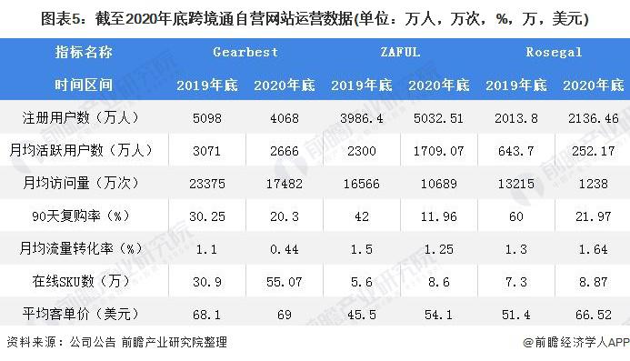 截至 2020 年底,跨境通旗下自營網站 Gearbest、ZAFUL、Rosegal 的注冊用戶分別為 4068 萬人、5032.51 萬人和 2136.46 萬人,合計注冊用戶達到 1.12 億人。截至 2020 年 12 月 31 日,公司主要自營網站的運營數據如下: