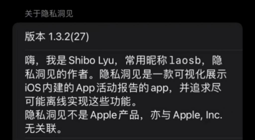 " 隱私洞見 " 版本介紹頁面顯示," 隱私洞見不是 Apple 產品,亦與 Apple,Inc. 無關聯 ",其中提到該軟件作者為 "Shibo Lyu"。"Shibo Lyu" 的 GitHub 個人網站介紹顯示,其姓名為呂世博,2019 年在杭電助手的業務需要下聯合創辦映快科技,呂世博持有映快科技(杭州)有限公司 20% 的股份。