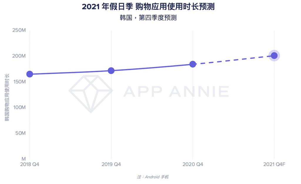 韓國用戶購物應(yīng)用的使用時(shí)長從 2018 年第四季度的 1.6 億小時(shí)左右增加到 2021 年第四季度的約 2 億小時(shí)——增長了 25%。