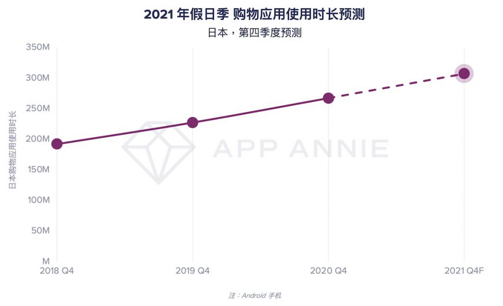 在 2021 年購物高峰期(2021 年第四季度),日本購物者預(yù)計(jì)將在購物應(yīng)用中花費(fèi) 3 億小時(shí)。相比之下,2018 年第四季度日本購物者的購物應(yīng)用使用時(shí)長為 2 億小時(shí)——僅在三年內(nèi)就增長了 33%。