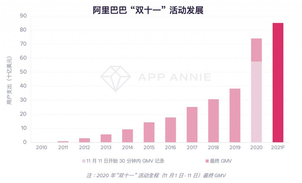 2019 年的阿里巴巴雙十一購物節(jié)單日商品交易總額(GMV)接近 400 億美元,我們預(yù)計(jì)今年的 GMV 總額將是 2019 年的兩倍,大約達(dá)到 850 億美元。