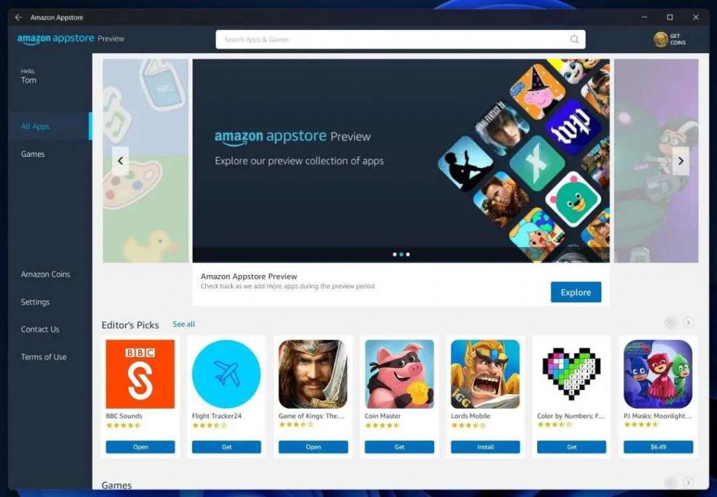 接下來,要將微軟商店更新到最新;將電腦的區域設置為美國,使用美國 IP 并申請一個美亞賬戶,來使用 " 亞馬遜應用商店 "。這些都搞完以后,你會發現亞馬遜應用商店只有 50 幾款應用可供選擇。