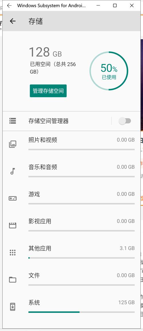 在這里可以發現,WSA 提供了 256GB 的虛擬存儲空間(非實際占用),存儲空間滿了也是要清理的。
