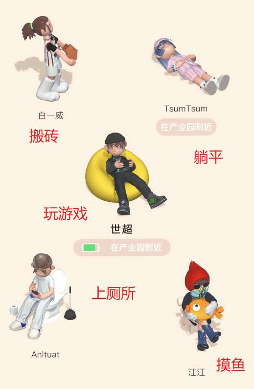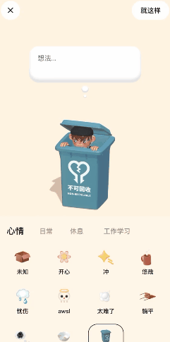 并且這些狀態(tài)都是加了了動(dòng)效的,比如:你設(shè)置了 emo,小人會(huì)鉆進(jìn)一個(gè)垃圾桶;設(shè)置了窮,小人會(huì)拿著一只飯碗要飯等等。