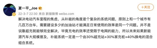 集度汽車 CEO 夏一平在微博發文談電動汽車里程焦慮難題。他表示,解決電動汽車里程的焦慮,從補能的角度是個復雜的系統問題," 并不是說靠超充就能夠完全解決,畢竟充電的效率還受限于電網的能力,所以未來如果新能源汽車大規模普及,補能系統一定是一個由 30% 超充站 +30% 家充樁 +40% 換電的混合組合系統 "。