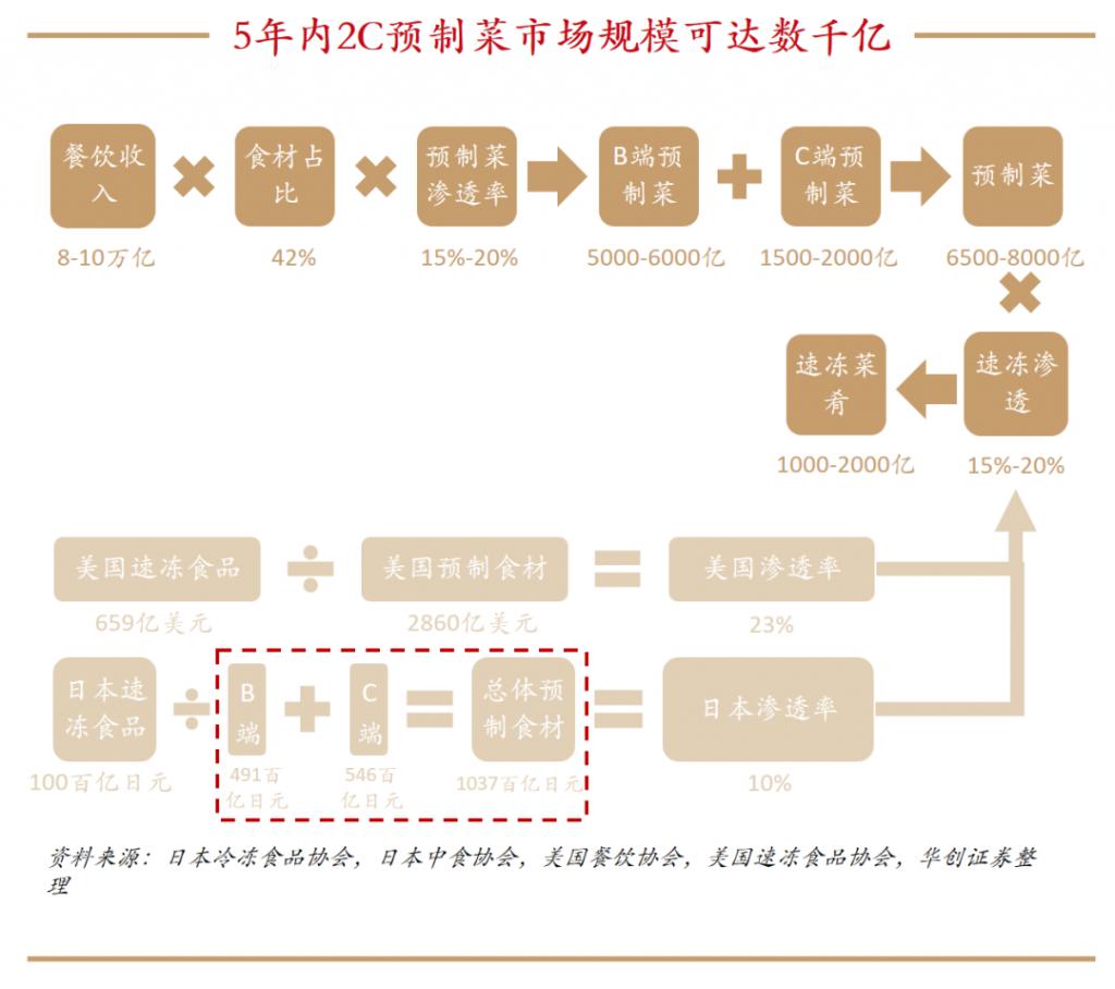 根據預制菜在餐飲食材滲透率 15%-20% 為基準進行測算,5 年內 2C 預制菜市場規模可達數千億元人民幣。參考美日速凍滲透率,以未來我國預制菜速凍滲透率 10%-15% 為基準測算,速凍菜肴(狹義預制菜)也將具有千億級市場空間。終局來看,數萬億生鮮市場將逐步被預制菜替代,預制菜市場本身將數達到萬億體量,成為居家做飯和餐廳廚師的主要解決方案。