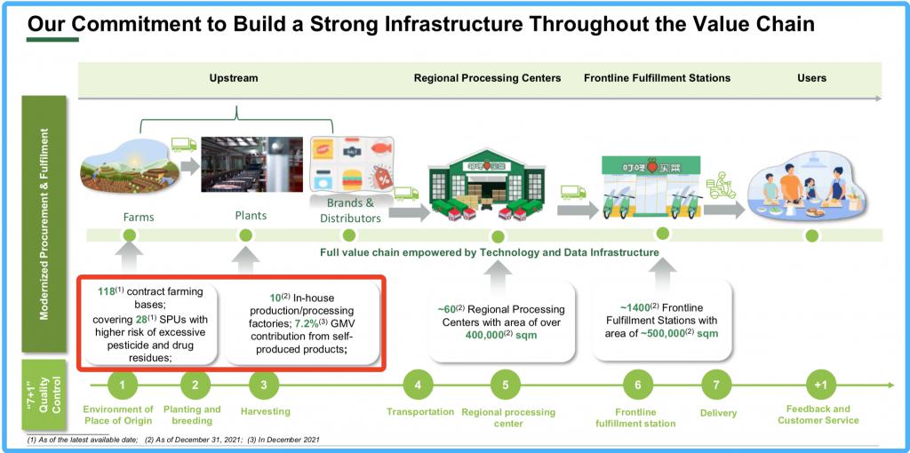 官方數據顯示,盒馬鮮生截至 2021 年 7 月已建成 550 余個農業直采基地和近 140 個盒馬村,還在 2020 年 4 月啟動了產業基地項目,計劃今年投入使用,年處理水果 14.6 萬噸、蔬菜 21.9 萬噸、鮮肉 10.95 萬噸;每日優鮮截至 2021 年 9 月也在全國擁有近 200 個 " 優鮮農場 " 直采基地;叮咚買菜截至 2021 年底已擁有 3 家農業示范園,簽署了 118 家訂單種植基地,并自建了 10 家食品研發加工廠。