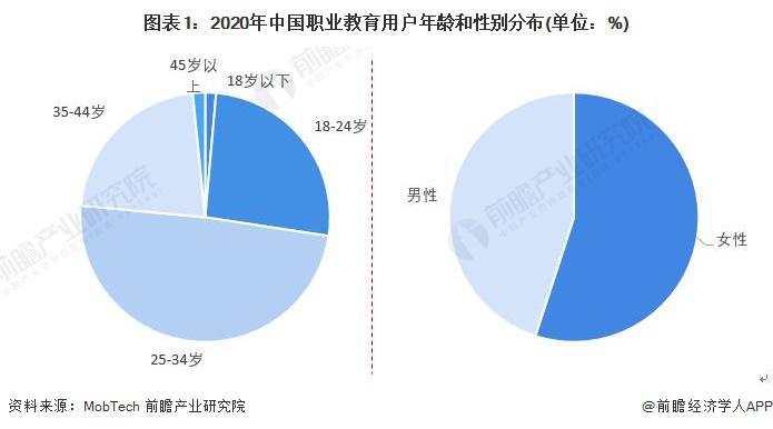 我國選擇職業(yè)教育的用戶年齡集中在 25-34 歲,占比接近 50%。女性對(duì)于職業(yè)教育的自驅(qū)動(dòng)力更強(qiáng),用戶占比接近 60%。另外,以專科學(xué)歷的用戶人群為主,占比過半。