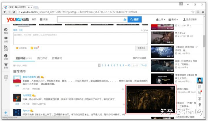 在 YouTube、優酷網頁上,用戶將播放器滾動出瀏覽器可視范圍之外后,頁面上會保留一個小的播放窗口,一直懸浮在右下角,這樣既方便查看評論, 又不影響觀看進度。