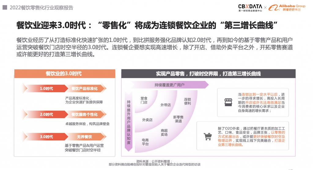 日前,第一財經商業數據中心(CBNData)聯合阿里巴巴集團客戶發展部發布《2022 餐飲零售化行業觀察報告》(以下簡稱《報告》)。《報告》顯示,疫情之下餐飲消費行為發生遷移,居家消費場景明顯增加,由此加速了餐飲行業的轉型——即除堂食、外賣外,餐飲行業已進入以零售產品突破餐飲門店時空半徑的 3.0 時代。